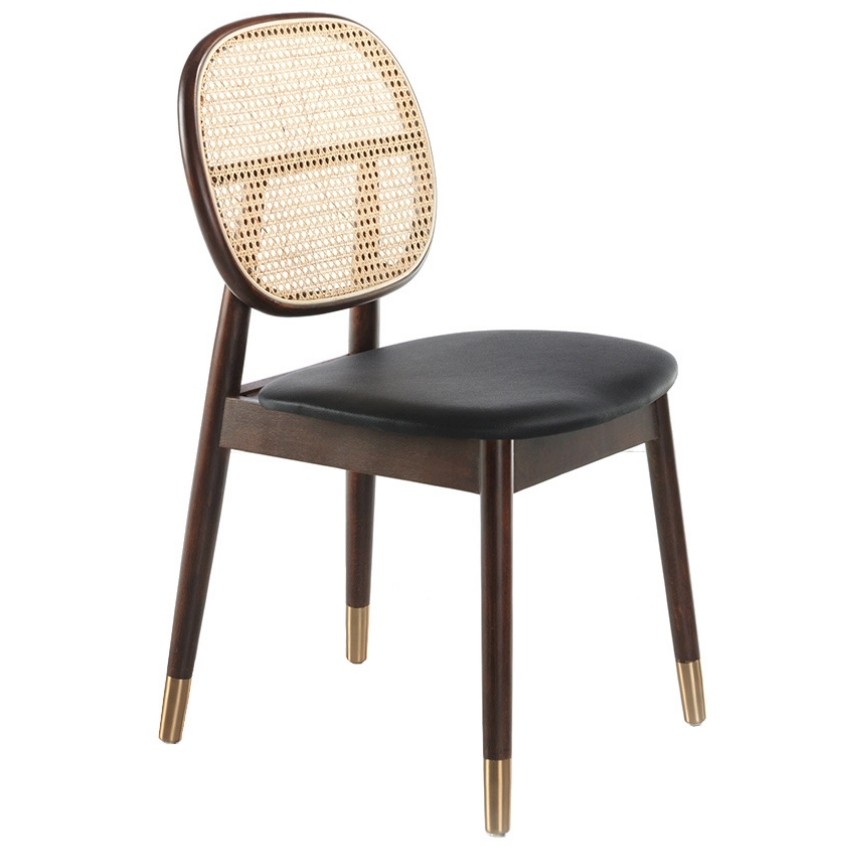 Jídelní židle Angel Cerdá s ořechovým dekorem, černým koženkovým čalouněním a ratanovým výpletem oválného opěradla přináší do vašeho domova teplo a eleganci. Moderní design a kvalitní materiály zaručují maximální pohodlí. Jistě oceníte také efektní detaily ve zlaté oceli a perfektní zpracování pevné jasanové konstrukce. Tento stylový kousek se skvěle hodí nejen do jídelny, ale i do pracovny nebo k toaletnímu stolku. Minimalistický a osobitý design dodá vašemu interiéru jedinečný nádech. Nechte svůj domov zazářit s touto elegantní a funkční židlí.