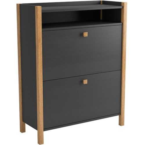 Přizpůsobte si svou předsíň moderní a elegantní botní skříňkou Hannover. Korpus je vyroben z tmavě šedého laminátu a celý je podepřen podnožím z masivního březového dřeva. Čisté lemované dřevěné detaily a tmavě šedý povrch přinášejí do vašeho domova lehkou eleganci. Díky dvěma vyklápěcím zásuvkám a praktické poličce získáte dostatek úložného prostoru pro vaši obuv a navíc bude tento stylový botník krásným kouskem ve vaší předsíni, který zaujme nejen vaše hosty. Doporučujeme ladit k ostatním kouskům z kolekce Hannover.